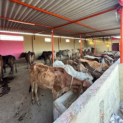 By the grace of Shri Radha Rani, we started this gaushala 4 years ago to help serve the cows of Vrindavan by providing means for their food, shelter, and medication. Our mission is to care for stray, abandoned cows, bulls, retired oxen, and orphaned calves. We provide them with hay, flour, fresh grass, clean water, medical attention, and a place where they can recuperate from injuries and stay peacefully.
